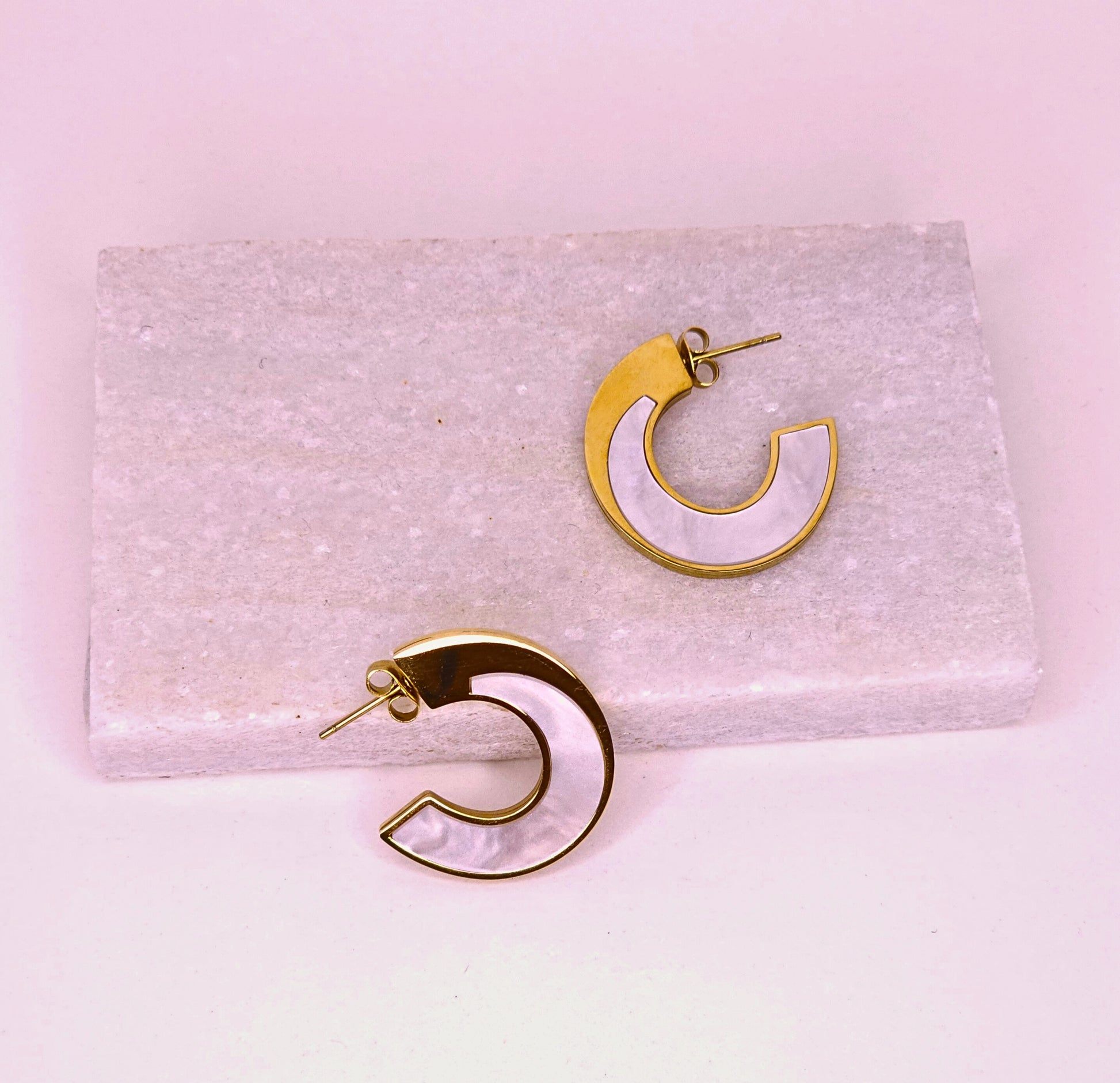 With mother-of-pearl–like accents that reflect a soft, moonlit glow, the Lunelle Demi Hoops offer a touch of timeless elegance to any style. Their graceful design makes them perfect for both everyday wear and special occasions, adding a subtle yet captivating charm. Crafted from high-quality stainless steel, they’re anti-tarnish, waterproof, and built to keep their luminous beauty season after season.